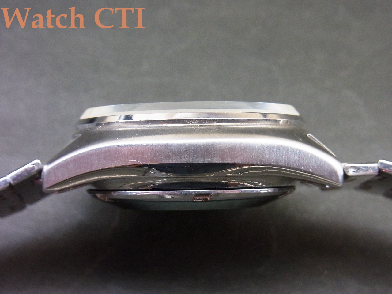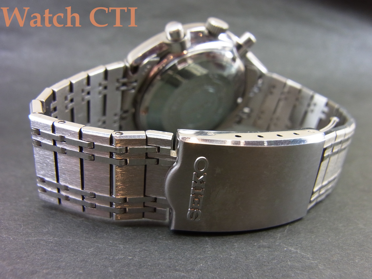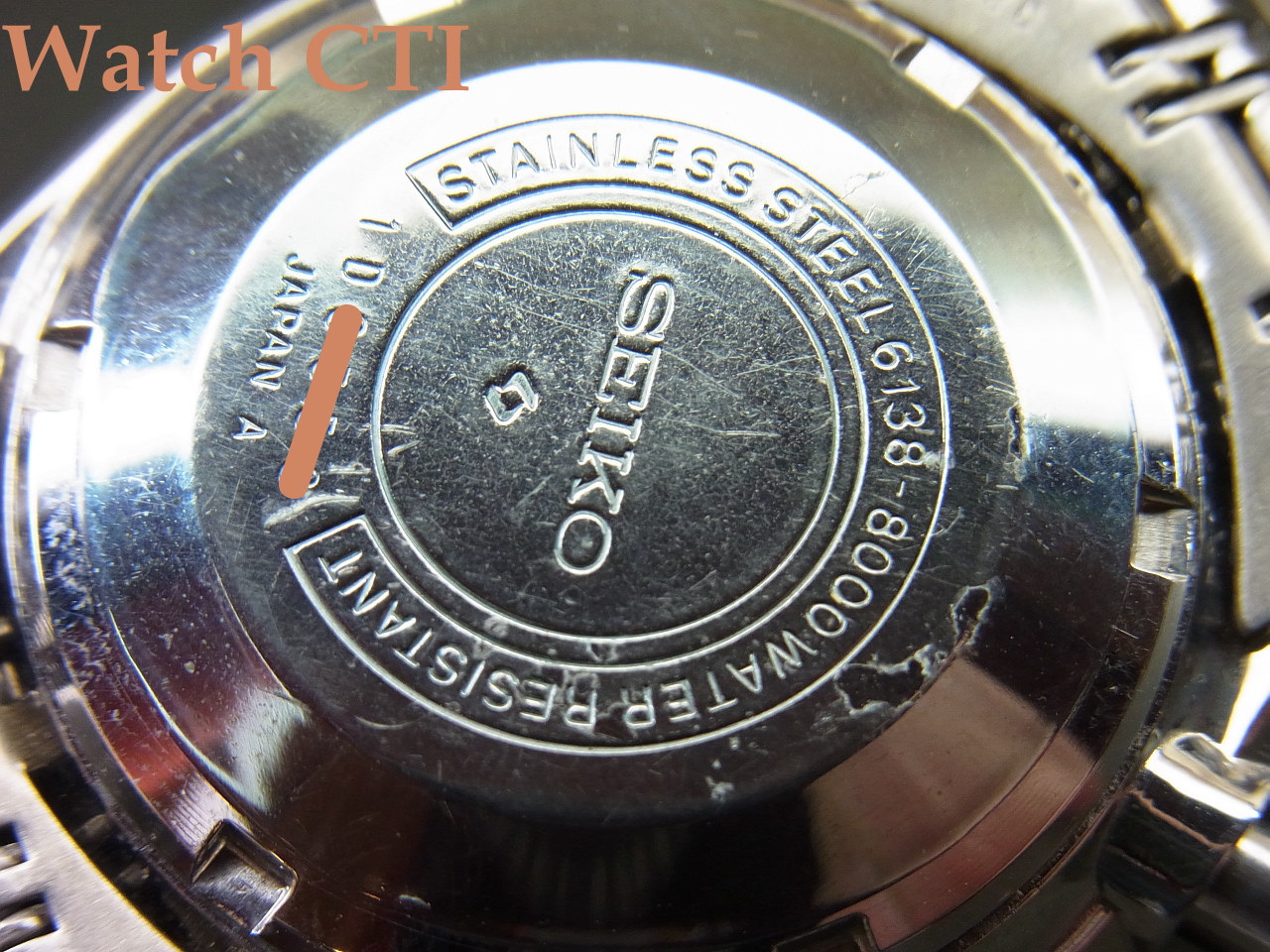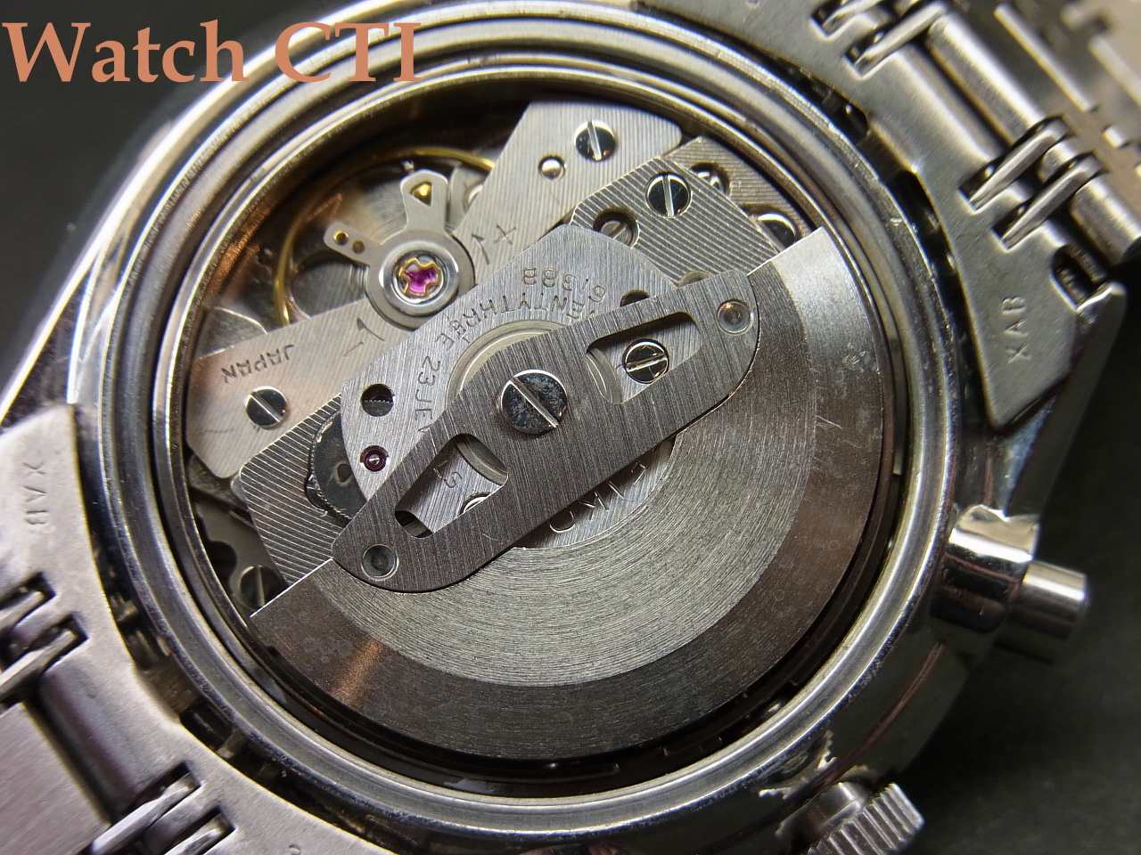 ケースバックには当時セイコーが塗布していた防傷用クリアコートが全面残っております。コート自体は肉眼で確認しずらいものですが、画像で一部剥離した状態の部分をアップしてございますのでご覧下さい。