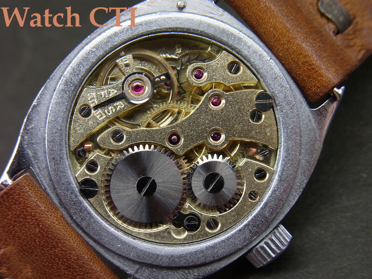 機械は粒金仕上げのもので、スイスのFHF(フォンテンメロン)10.5型に相当に似ていますが確実にFHFエボッシュなのかははイマイチ判明しませんでした…しっかりした作りで、ダイヤルスモセコの上にドイツ語で表示されているようにテンプ受石に耐震デバイスが組み込まれております。このデバイスもちょっと見かけないタイプのもので、ひょっとするとムーブと共にスイスエボシュのドイツ製ライセンスものなのかなとも感じております…..。