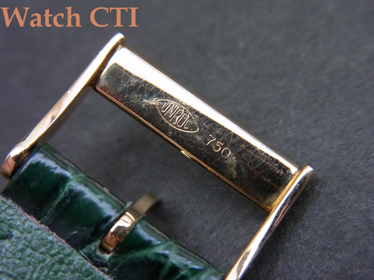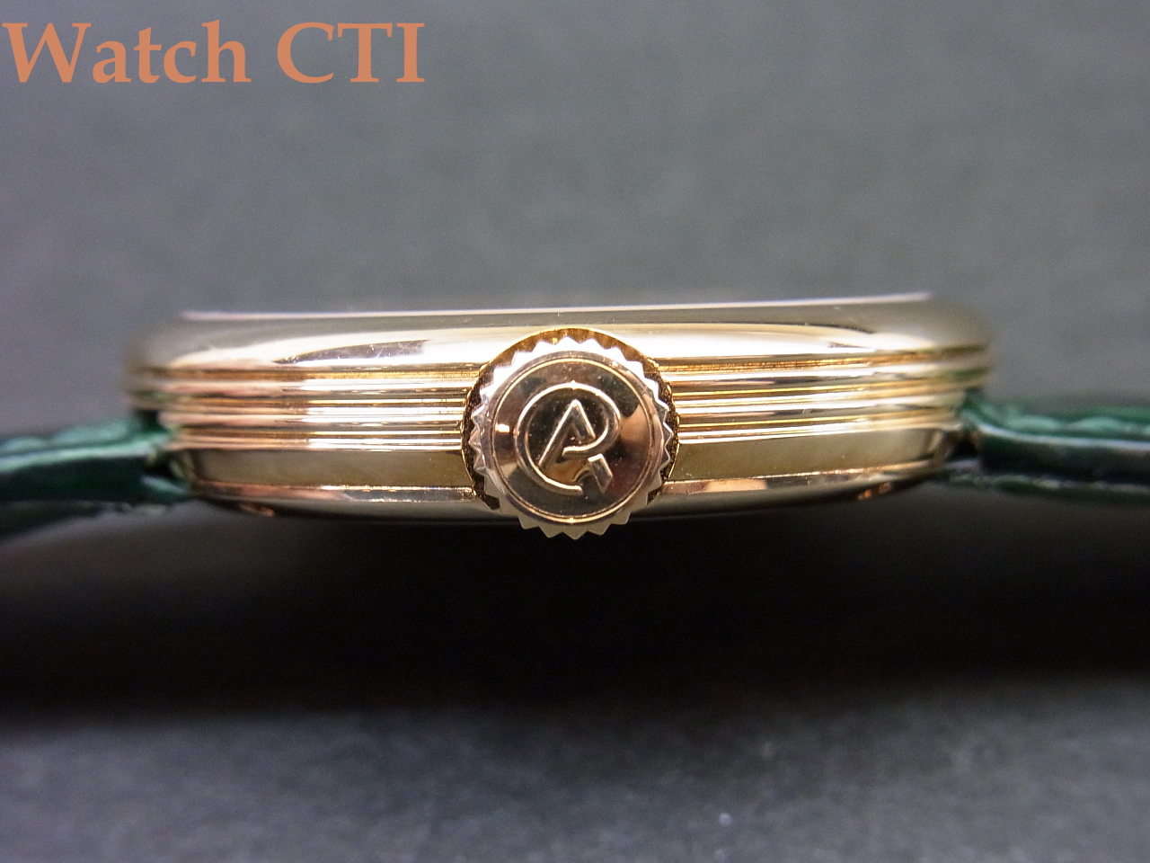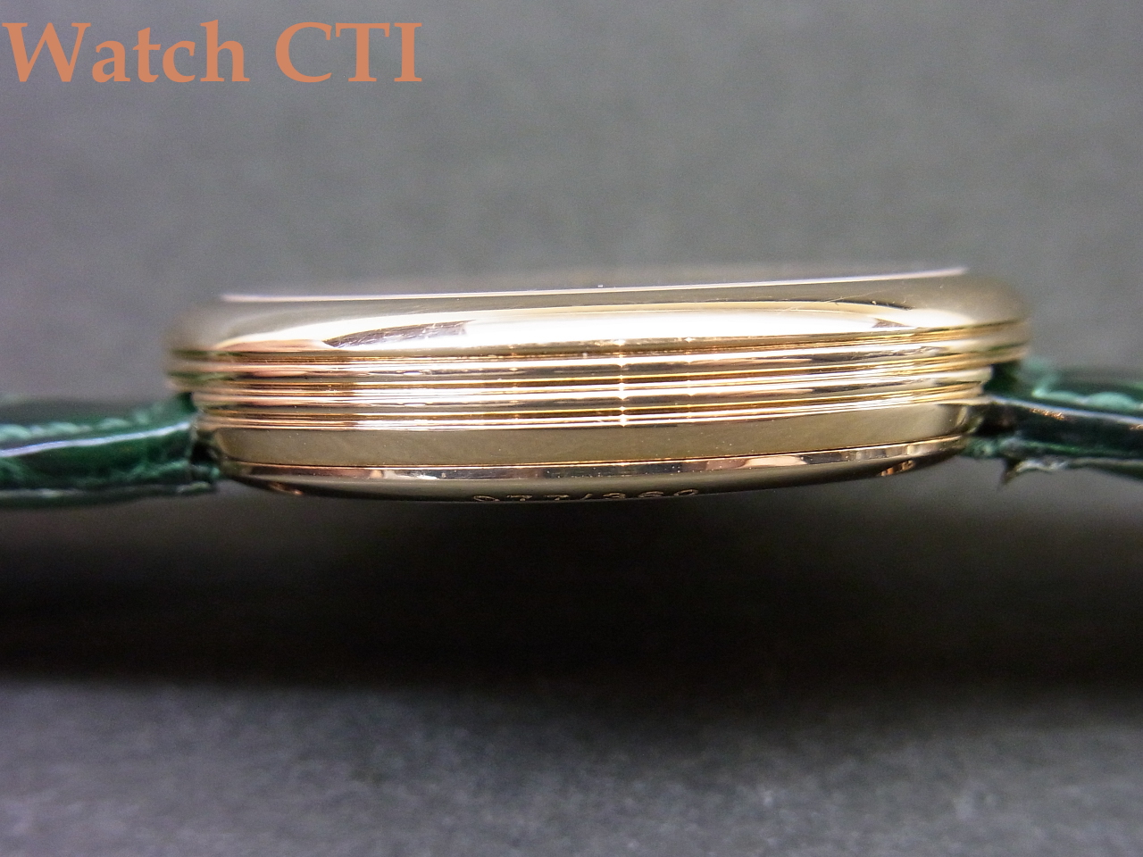 *付属品はございません。ベルトのバックも純正18KYGです。そのベルトですが、ケースへの取付形状が円弧状で特殊、かつ裏蓋に4本のネジで留め込んだベゼル上のもので抑えておりますので交換にはそれなりな対応が必要となります。現状はグロスクロコダイルのグリーンカラーものが付属しており全体の雰囲気と大変マッチしております!