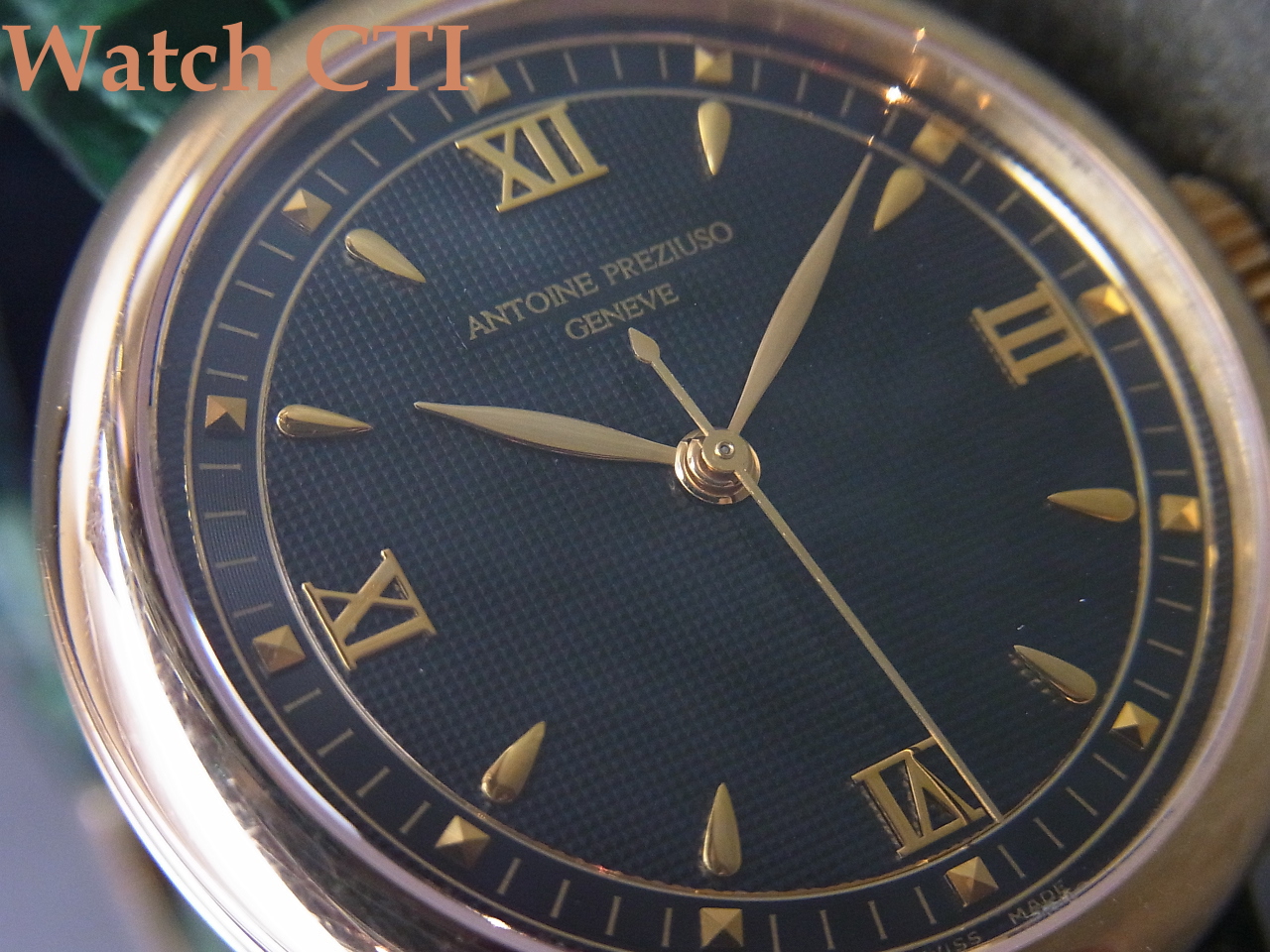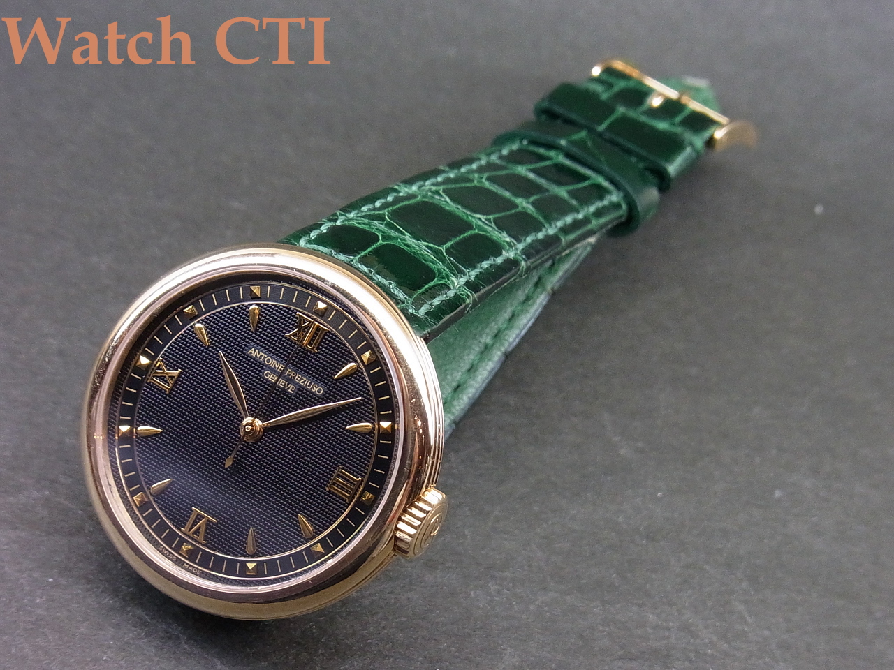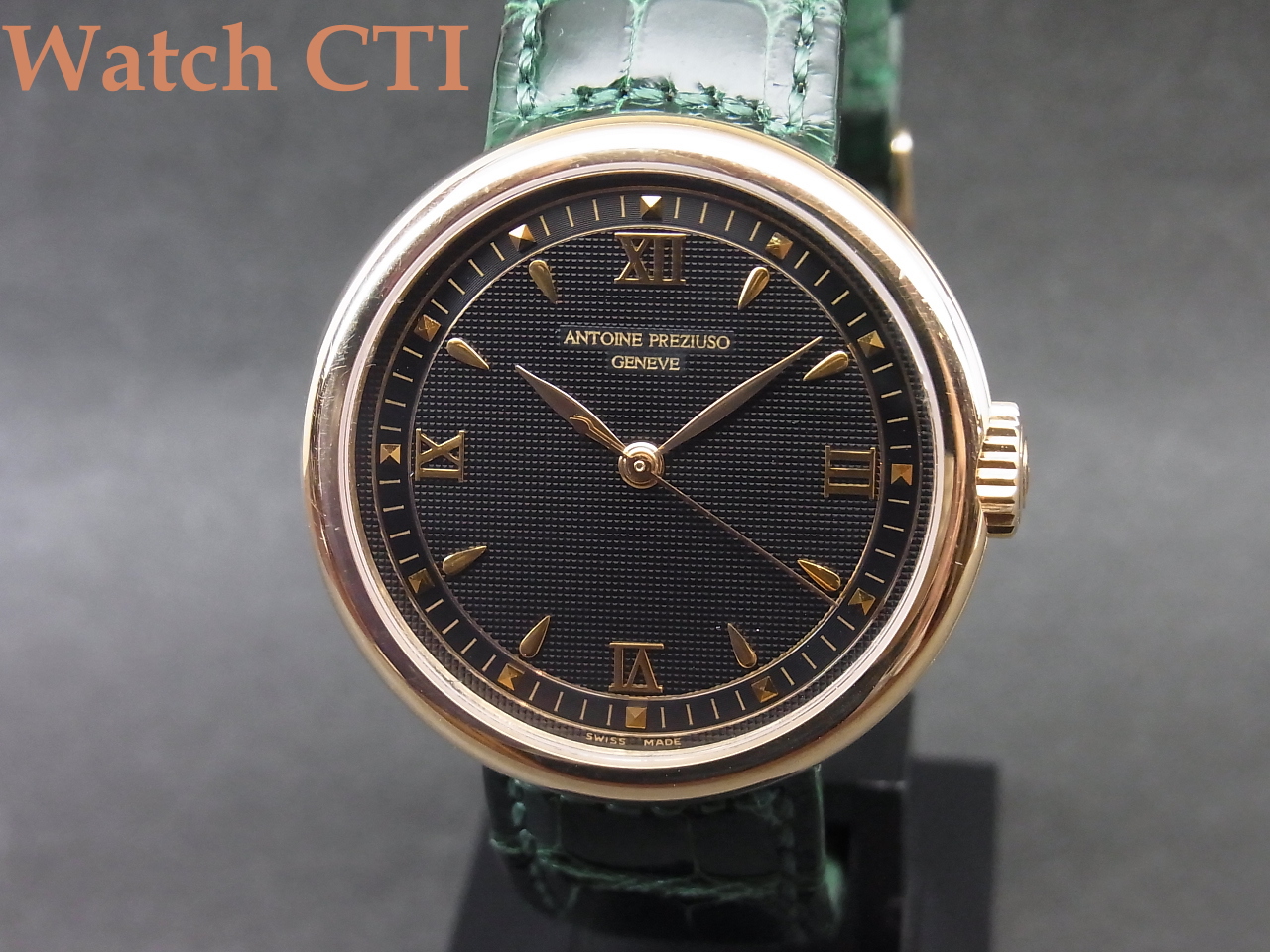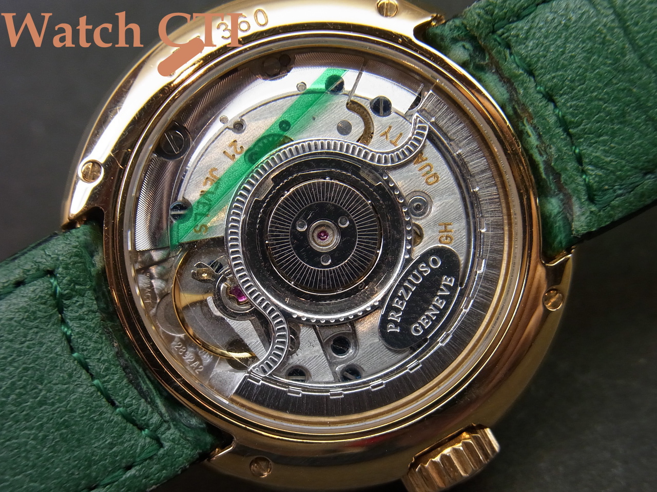 *付属品はございません。ベルトのバックも純正18KYGです。そのベルトですが、ケースへの取付形状が円弧状で特殊、かつ裏蓋に4本のネジで留め込んだベゼル上のもので抑えておりますので交換にはそれなりな対応が必要となります。現状はグロスクロコダイルのグリーンカラーものが付属しており全体の雰囲気と大変マッチしております!