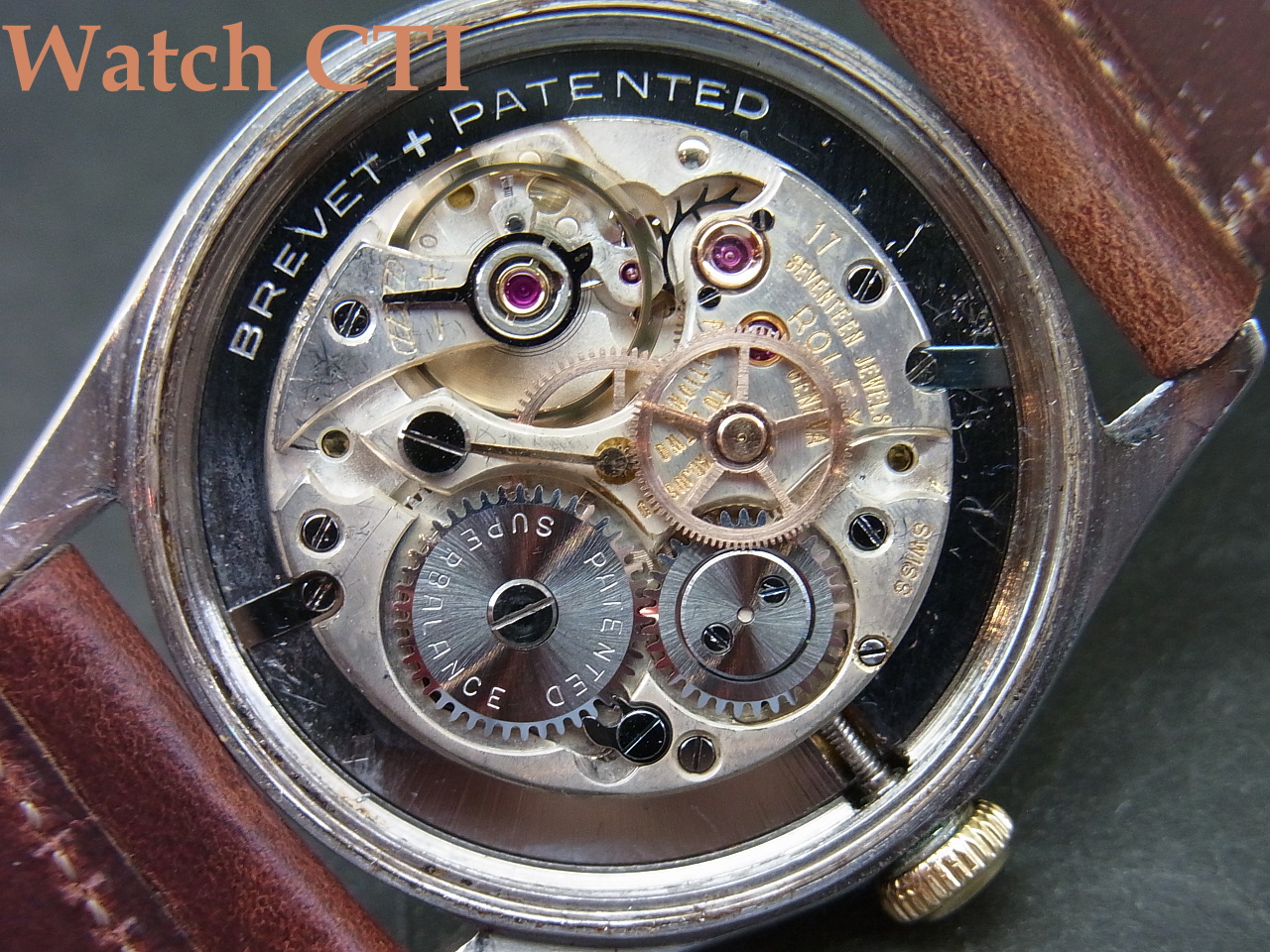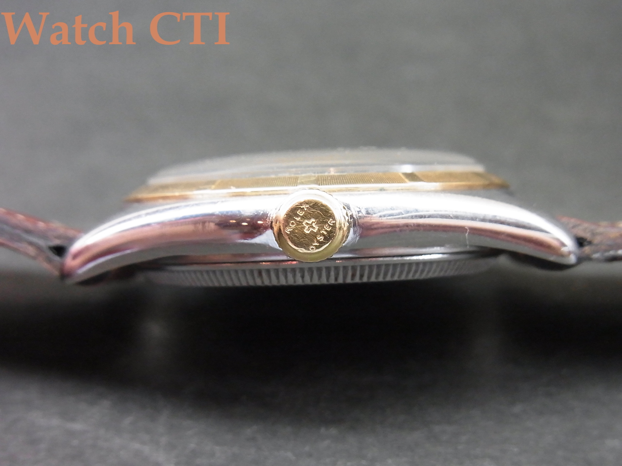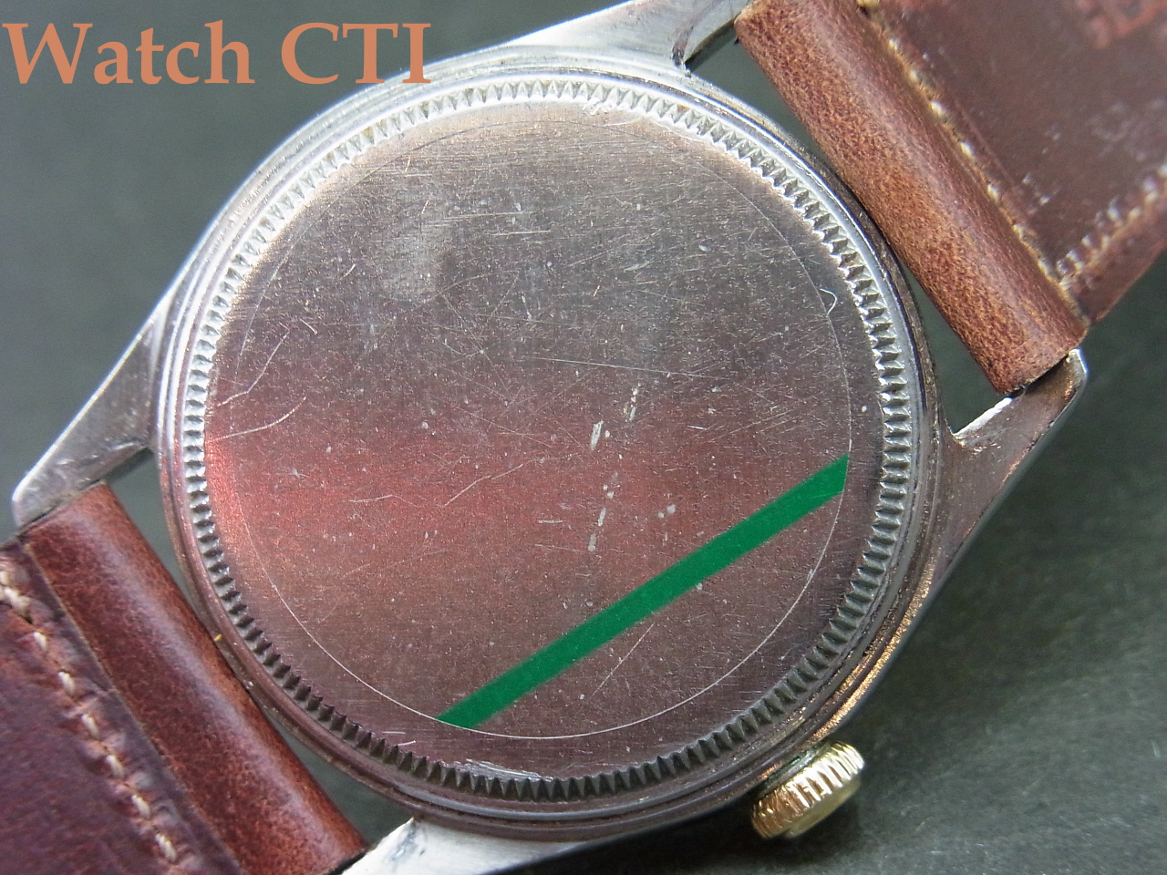 なにより、この19ミリサイズのラグ間幅や、アプライドのアラビックとクサビインデックスのミックスなどその後50年代の中~後期までロレックスの多くの機種で見られる意匠となります。そして、現品、パウダーホワイトダイアルの微妙なヤケ具合といい、ベゼルのシャープに残った感と言い….全体に素晴らしいヴィンテージロレックスを体現しておりますね!!