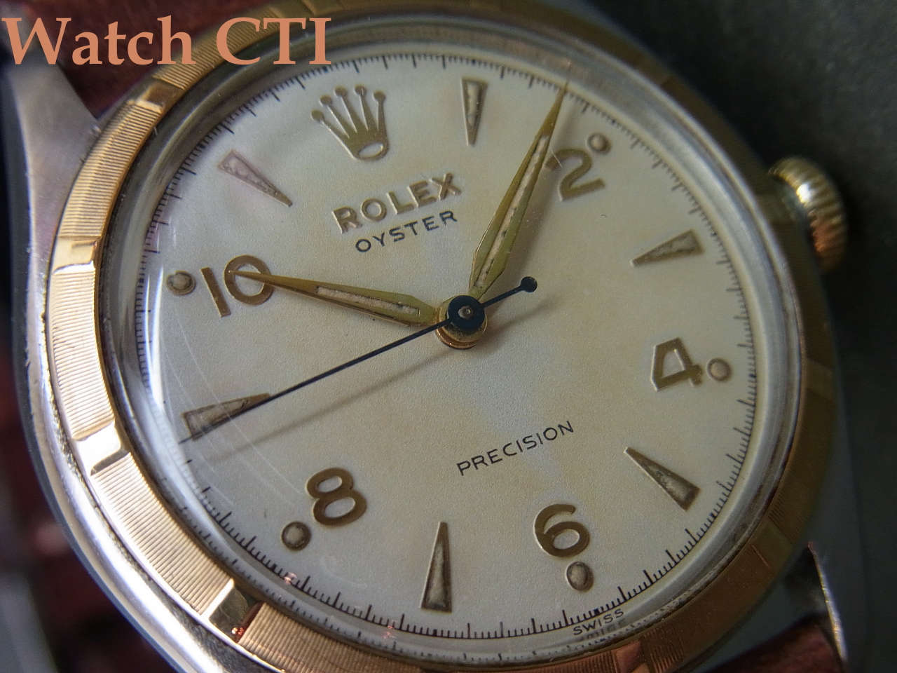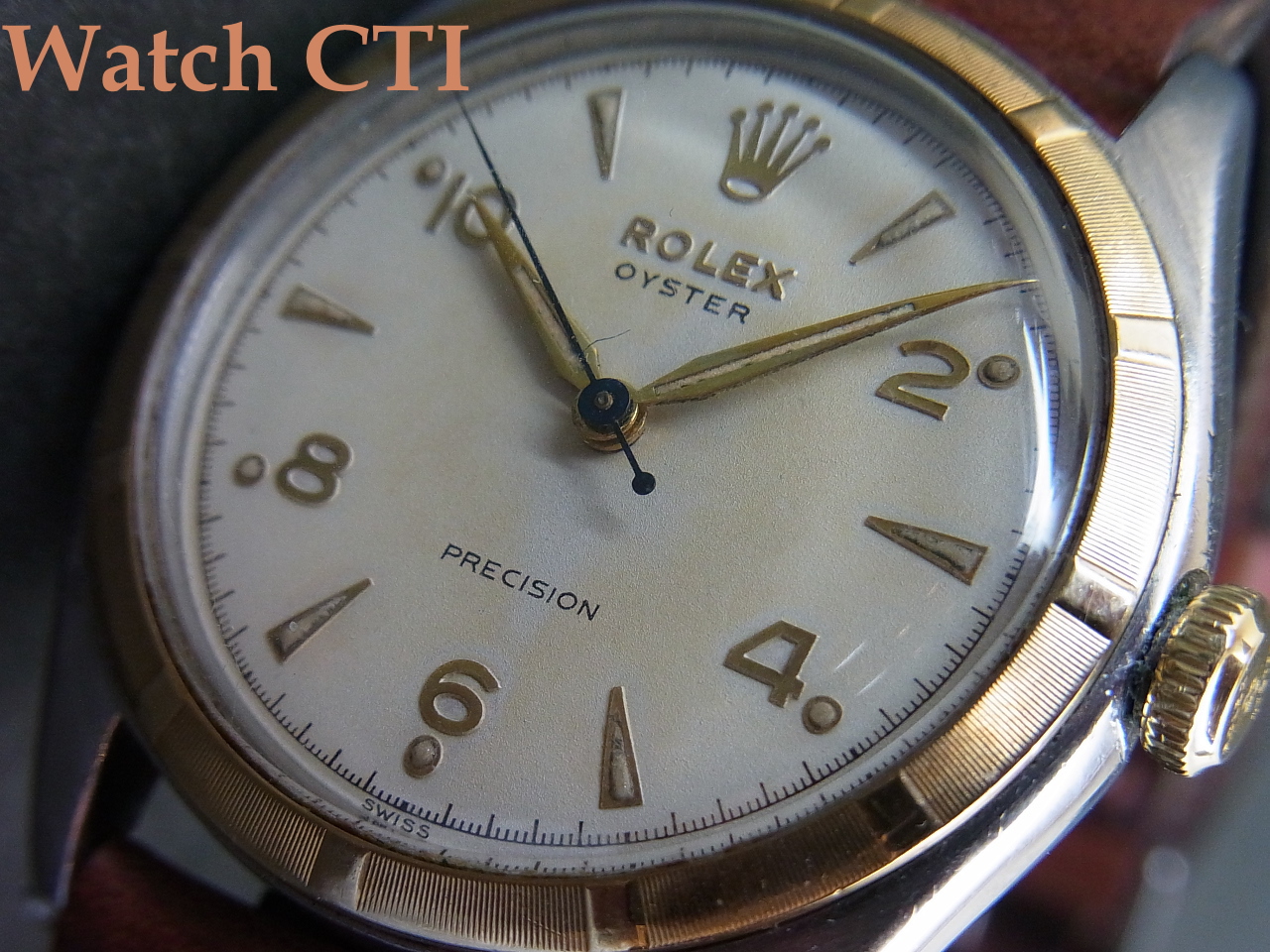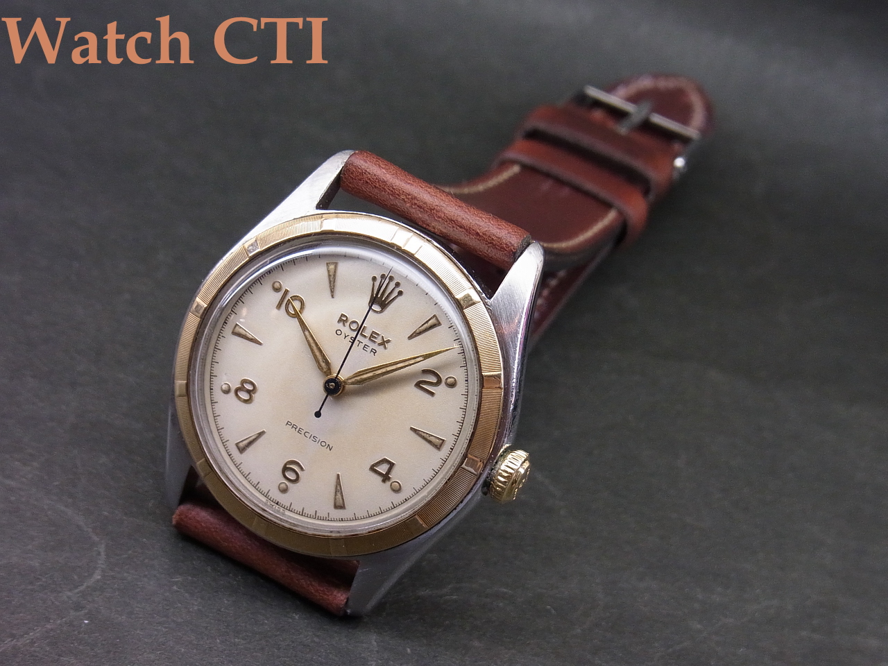 なにより、この19ミリサイズのラグ間幅や、アプライドのアラビックとクサビインデックスのミックスなどその後50年代の中~後期までロレックスの多くの機種で見られる意匠となります。そして、現品、パウダーホワイトダイアルの微妙なヤケ具合といい、ベゼルのシャープに残った感と言い….全体に素晴らしいヴィンテージロレックスを体現しておりますね!!